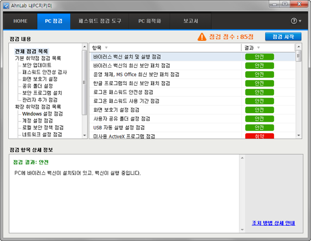 PC 점검에서는 기본 취약점 목록과 확장 취약점 목록에 대해 검사를 수행할 수 있습니다.