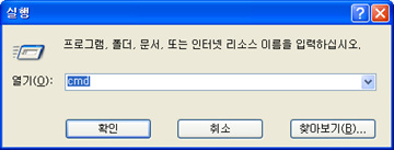 시작 > 실행을 누른 후 입력창에 cmd를 입력합니다.