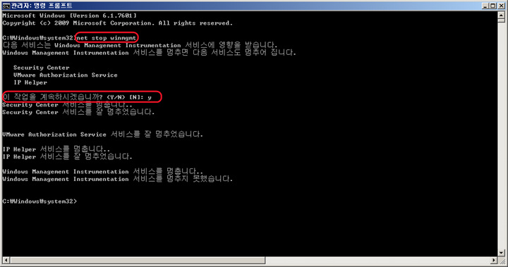 명령어 창에 net stop winmgmt를 입력합니다. ***서비스를 멈추면 다음 서비스도 멈추어집니다. 이 작업을 계속 하시겠습니까? 라는 메시지에 Y를 입력합니다.