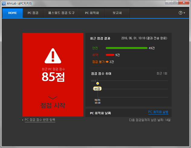 실행된 <AhnLab 내PC지키미>의 HOME 화면에서 점검 시작을 누릅니다.