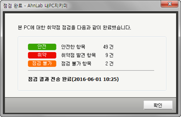 <점검 완료>가 나타나면 안전, 취약, 점검 불가 항목에 대한 결과를 확인할 수 있습니다.