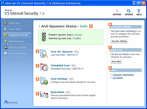 You can check the history of tasks you ran related to spyware security. Also you can check the history of spyware scan, repair, and prevention tasks done by AhnLab V3 Internet Security 7.0 Platinum Enterprise.