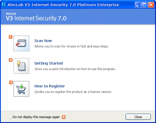 If you click Do Not Display This Message Again and click Close, the Welcome Screen will not appear from the next time you start AhnLab V3 Internet Security 7.0 Platinum Enterprise. To see this Welcome Screen again, click Welcome Screen in Help.