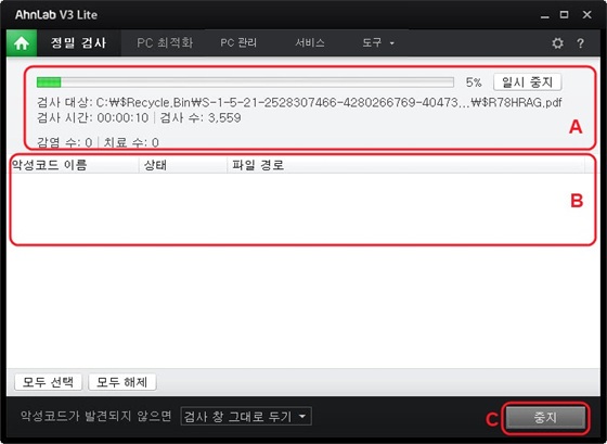 다시 시작: 일시 중지를 누르면 일시 중지 버튼의 이름이 다시 시작으로 변경됩니다. 검사를 다시 시작할 수 있습니다.