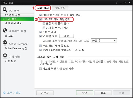 USB 드라이브 검사는 사용자 PC에 USB나 외장 하드와 같은 USB 미디어를 연결했을 때 자동 검사하는 기능입니다. USB 드라이브 검사를 사용하려면 환경 설정에서 USB 드라이브 자동 검사를 선택해야 합니다.