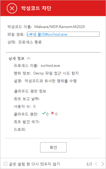 랜섬웨어 의심 프로세스가 디코이(Decoy) 파일에 접근하거나 수정하려는 시도가 있으면, V3는 이를 랜섬웨어 의심 행위로 탐지하여 다음과 같이 차단 알림 창을 통해 해당 프로세스가 차단되었음을 알려줍니다.