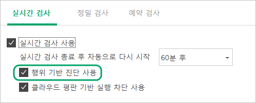 디코이(Decoy) 파일을 이용한 랜섬웨어 진단 기법을 사용하려면, 다음과 같이 V3의 환경 설정에서 행위 기반 진단 기능을 사용하도록 설정해야 합니다.