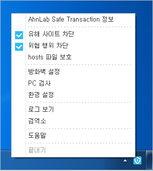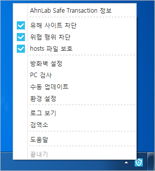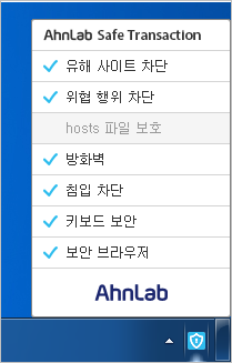 사용자는 제공되는 보안 기능 중 유해 사이트 차단, 위협 행위 차단, hosts 파일 보호 기능을 중지할 수 있습니다. 사용자는 신뢰하는 특정 사이트에 접속하거나, 다른 프로그램을 실행하면서 수행되는 일련의 동작에 대해 AhnLab Safe Transaction이 이를 탐지하여 차단하려 할 경우 해당 기능을 잠시 사용하지 않고 기존 작업을 수행할 수 있습니다.