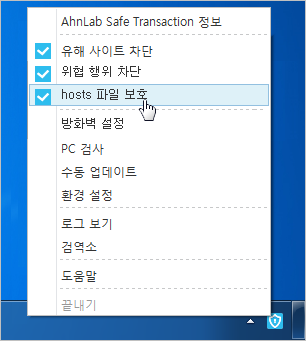 보안 기능 중 유해 사이트 차단, 위협 행위 차단, hosts 파일 보호는 메뉴에서 바로 끄거나 켤 수 있습니다. 보안 기능을 끄거나 켜는 방법의 한 예로 hosts 파일 보호를 끄는 방법에 대해 설명합니다.
