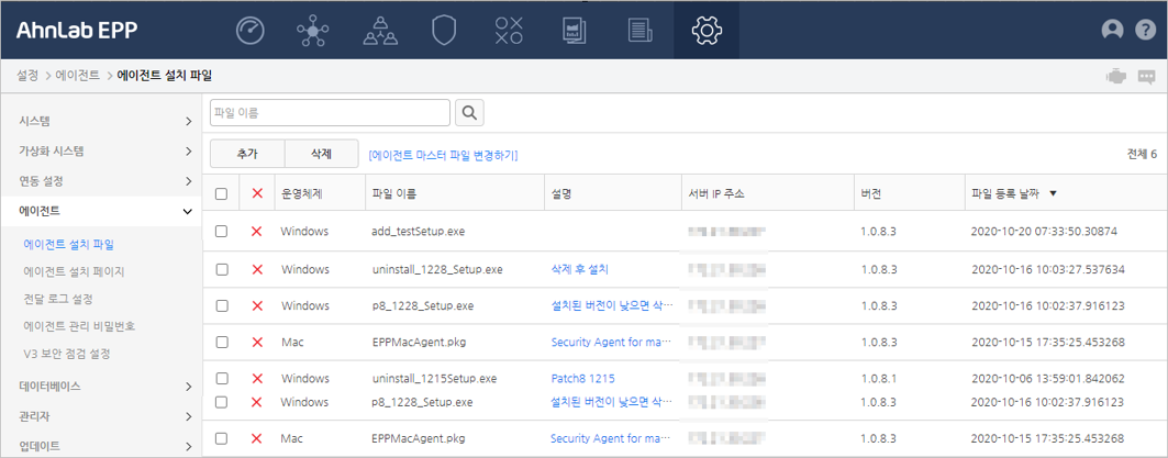 등록된 에이전트 설치 파일을 삭제하는 순서는 다음과 같습니다.