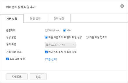 Windows 및 Mac 운영체제에 설치할 에이전트 설치 파일을 생성하거나 기존에 생성된 설치 파일을 업로드할 수 있습니다.