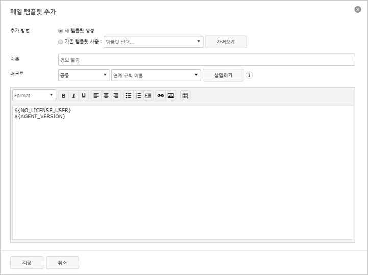 알림 메일 발송 시에 사용할 템플릿을 추가, 수정, 삭제 및 검색할 수 있습니다. 미리 생성한 메일 템플릿을 가져오기 기능을 통해 가져올 수 있습니다.