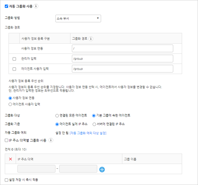 설정 저장 시 즉시 적용: 해당 기능 선택 시, 설정을 저장하는 시점에 설정된 자동 그룹화와 IP 주소 대역별 그룹화를 즉시 적용합니다.