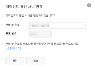 <에이전트 통신 서버 변경>이 나타나면 서버 IP 주소를 설정합니다.
