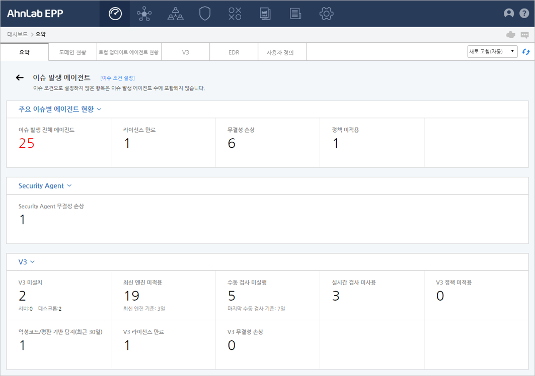 하나의 에이전트가 여러 이슈 조건을 만족하는 경우, 이슈 발생 전체 에이전트에는 1대로 카운트됩니다.(예: 특정 에이전트가 '라이선스 만료' 와 '무결성 손상' 조건을 둘다 만족하는 경우 1대로 카운트됨)
