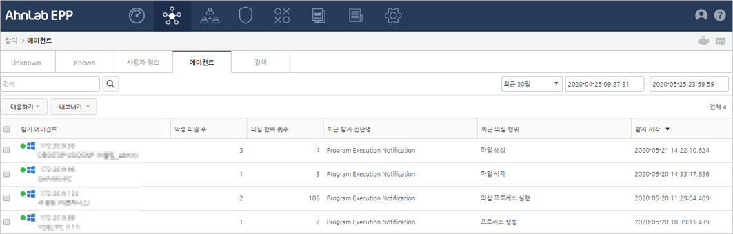 에이전트 목록에서는 의심 행위가 발생한 에이전트 단말에 대한 정보를 확인할 수 있습니다. 탐지된 에이전트를 선택하고 대응하기 명령을 통해 대응 명령을 내릴 수 있고, 특정 에이전트만 검색하거나 기간을 지정하여 특정 기간내에 탐지된 에이전트를 검색할 수 있습니다. 탐지 에이전트를 확인하는 방법은 다음과 같습니다.