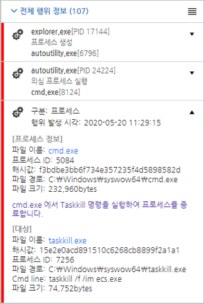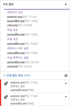 전체 행위 정보 상세 보기: 전체 행위 정보의 상세 정보를 확인할 수 있습니다. 전체 행위 정보 하위의 프로세스나 파일명을 클릭하면 상세 정보가 표시됩니다.