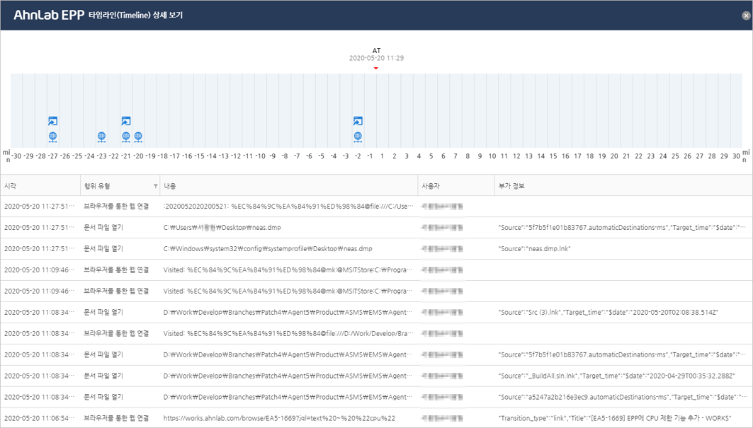 탐지 시각을 기준(AT)으로 전, 후 30분 동안 탐지된 Artifacts 행위를 표시합니다. 타임라인(Timeline)에서 표시하는 행위 유형에는 문서 파일 열기, 브라우저를 통한 웹 연결, 파일 다운로드 등이 있습니다.
