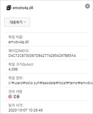 서명자: 탐지된 파일의 서명자가 표시됩니다. 예) Microsoft Windows