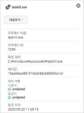 연관 관계 다이어그램에서 프로세스 아이콘을 클릭하면 화면 오른쪽에 탐지된 프로세스에 대한 정보가 표시됩니다. 탐지된 프로세스에 대한 대응으로 프로세스 종료 명령을 내릴 수 있습니다.