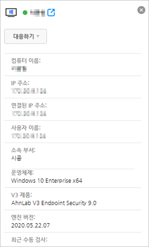 악성코드 검사: 악성코드가 탐지된 에이전트 컴퓨터의 악성코드 감염 여부를 검사합니다. 서버에서 에이전트 단말에 악성코드 검사 명령을 전달하면 에이전트 컴퓨터에 설치된 보안 제품이 검사 설정에 따라 에이전트 컴퓨터를 검사합니다. 악성코드 검사 방법과 치료 방법은 보안 제품에 설정된 검사 방법과 치료 설정에 따라 처리합니다.