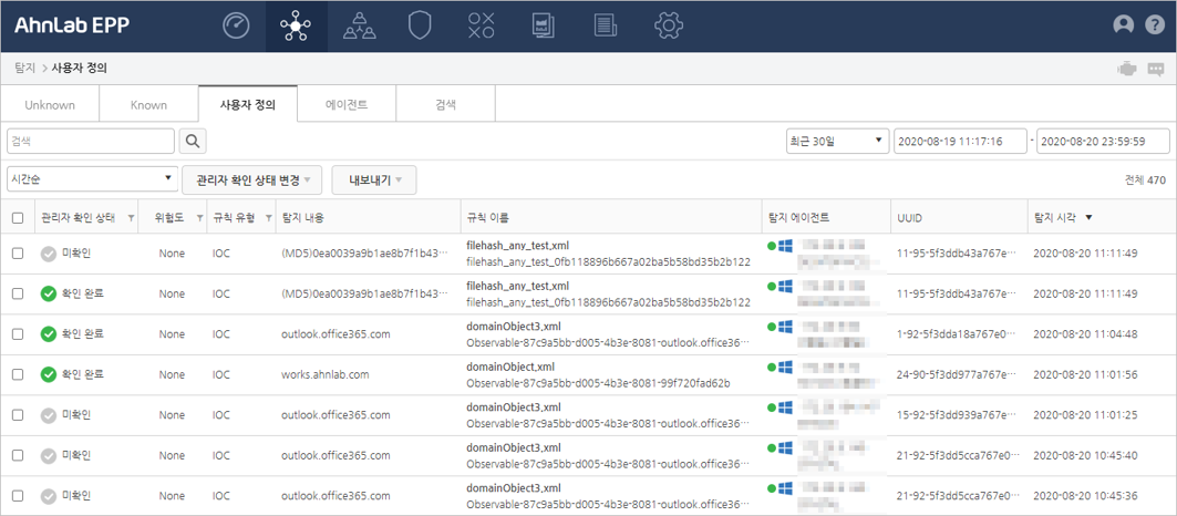 - 탐지 에이전트: IOC나 YARA 규칙이 탐지된 에이전트의 컴퓨터 이름과 IP