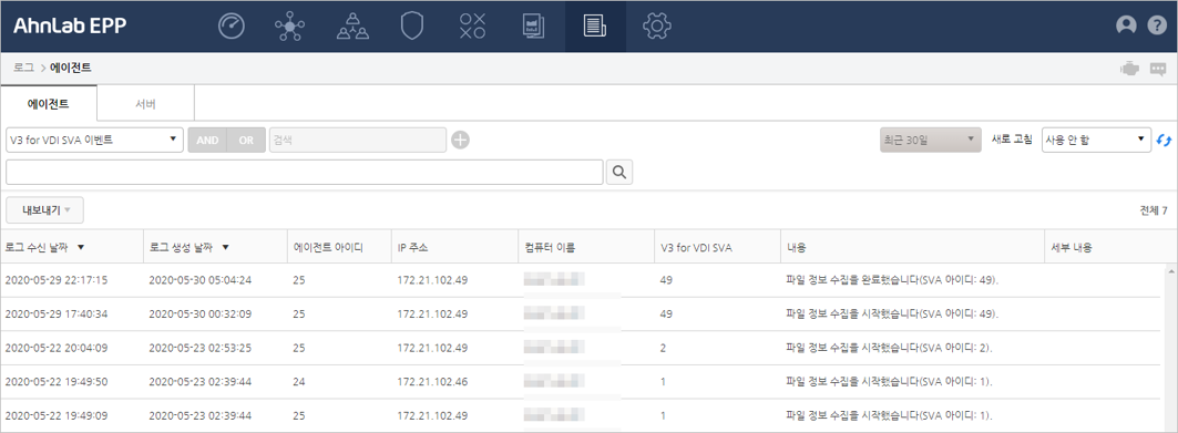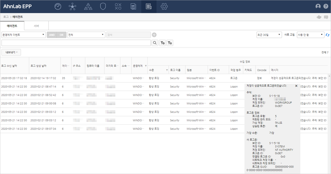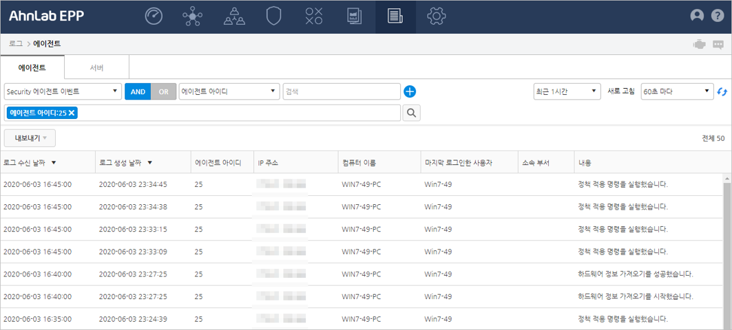 에이전트에서 발생한 이벤트별 로그를 확인할 수 있습니다. 이벤트 로그를 검색하는 방법은 다음과 같습니다.