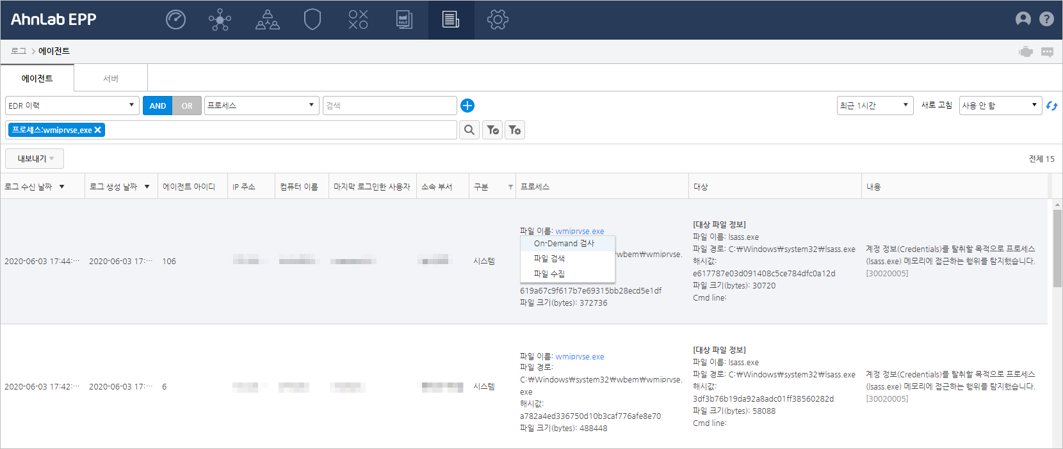 내용: EDR 행위 진단 내용이 표시됩니다. 예) 프로세스 생성, 데이터 파일 다운로드
