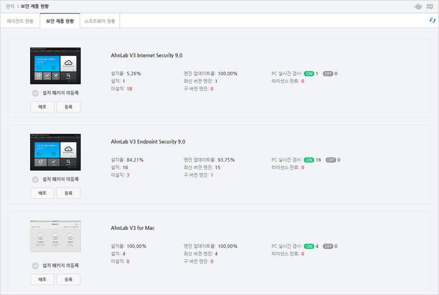 메뉴에서 관리 > 보안 제품 현황을 선택합니다.