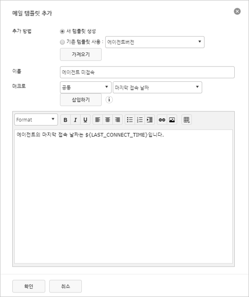 메일 템플릿: 알림 메일 발송 시 템플릿 선택...을 클릭하여 미리 생성한 템플릿을 이용하거나, 추가를 클릭하여 새 템플릿을 생성하거나 기존 템플릿을 가져오기할 수 있습니다.