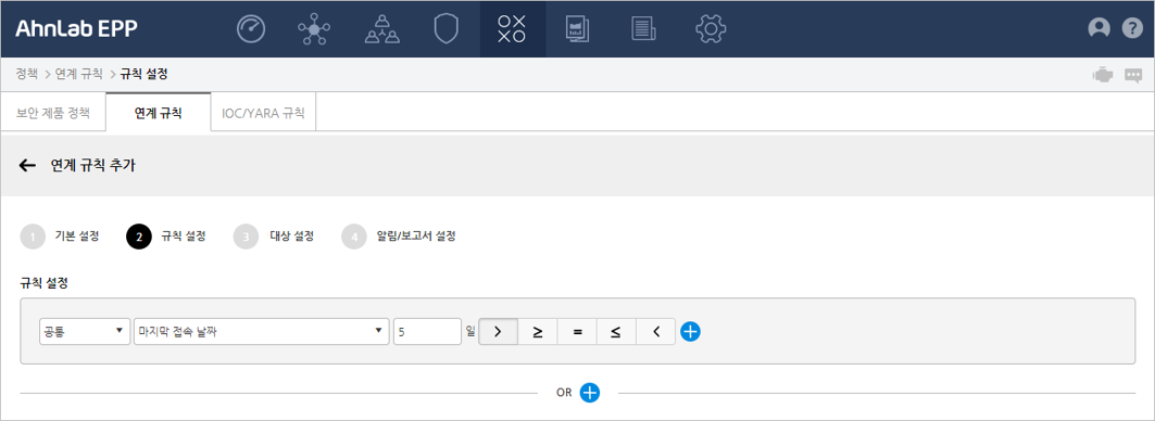 V3, EDR 규칙 설정 시, 설정하는 시간 조건('분 이내')은 연계 규칙 추가 시 첫 단계에서 설정한 검색 주기보다 작게 설정해야 합니다.