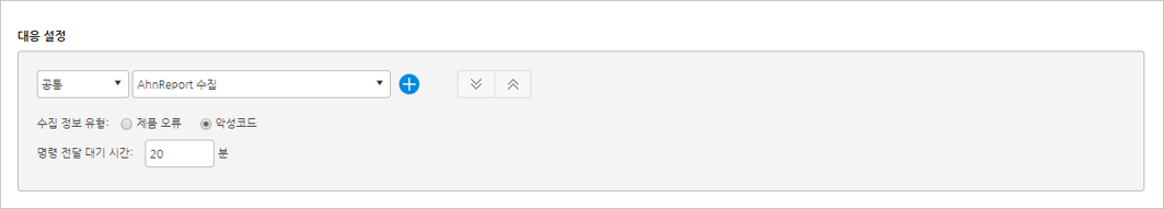 AhnReport 수집: 규칙을 만족하는 에이전트를 대상으로 에이전트가 설치된 시스템의 AhnReport를 수집합니다. AhnReport 수집 시, AhnReport 수집 유형을 제품 오류와 악성코드에서 선택하여 수집할 수 있습니다. 제품 오류 선택 시, 제품의 동작상에 오류가 발생한 경우 원인 분석을 위한 시스템 정보, 제품 정보 및 로그 정보를 수집합니다. 악성코드 선택 시, 악성코드 분석을 위한 시스템 정보, 의심 파일, 제품의 엔진 정보등 다양한 정보를 수집합니다. AhnReport 수집 명령 전달 대기 시간은 30~120분 사이의 값을 입력할 수 있습니다. 예를 들어 명령 전달 대기 시간을 20분으로 설정한 경우, 20분이 경과하도록 에이전트에서 응답이 없는 경우 명령 전달에 실패한 것으로 판단합니다.