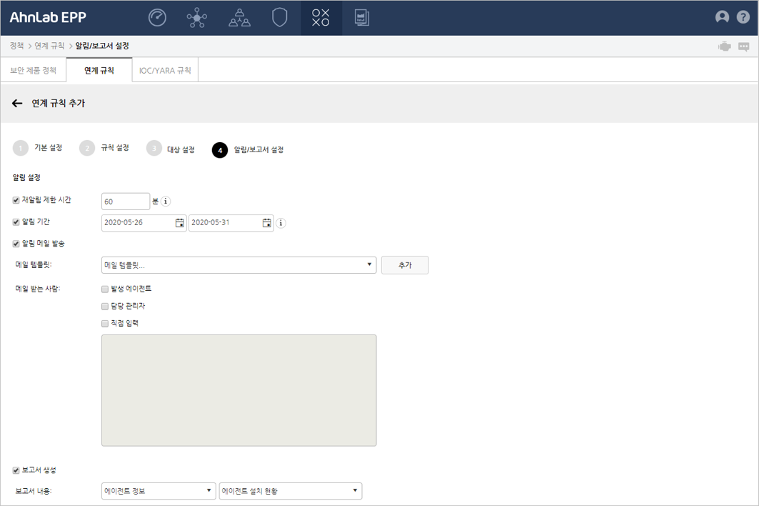 (1)기본 설정, (2)규칙 설정, (3)대상 설정, (4)알림/보고서 설정에서 필요한 항목을 설정합니다.