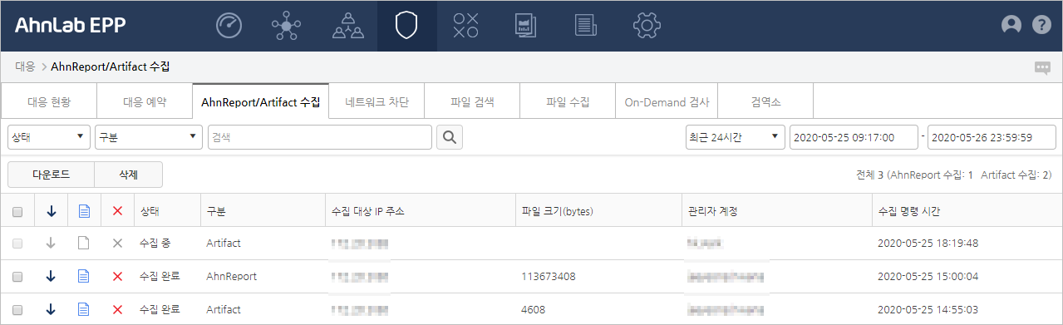 상태: 대응 명령의 진행 상태입니다. 상태는 수집 중, 수집 완료, 수집 실패로 구분하여 표시합니다.