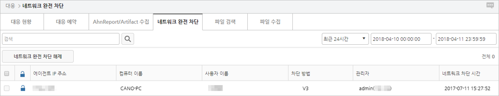 네트워크가 차단된 에이전트 정보를 확인할 수 있고, 네트워크가 차단된 에이전트로 네트워크 차단 해제 명령을 내릴 수 있습니다.