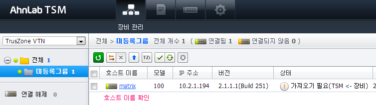 관리에서 미등록 그룹에 장비의 호스트 이름이 등록되었는지 확인합니다.