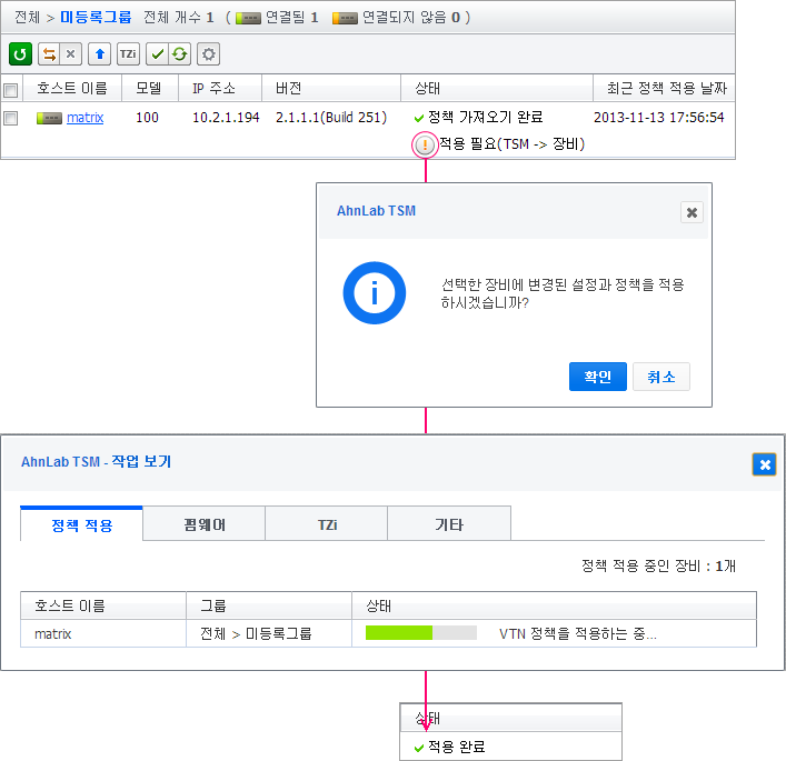 적용은 TSM에 정의된 시스템 설정과 정책을 장비로 전송하여 환경 설정 파일에 기록하고 관련 서비스 프로세스를 재구동하는 것을 의미합니다.