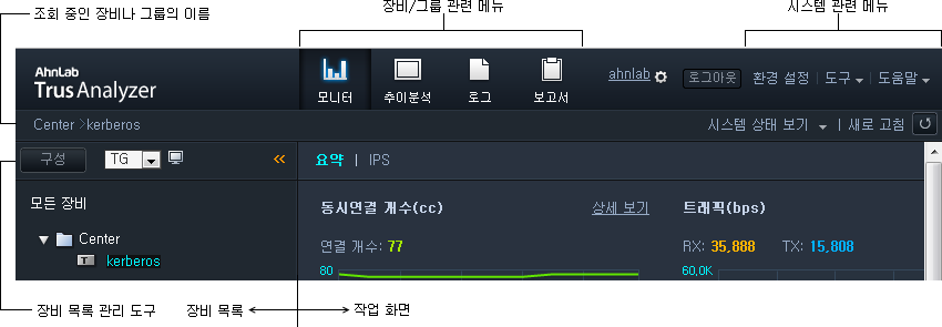 TSM가 관리자에게 제공하는 사용자 인터페이스 장비 목록, 메뉴, 작업 화면으로 구성됩니다.