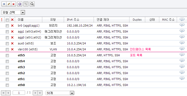 인터페이스 목록에서 장비의 네트워크 포트(줄여서 "포트")와 네트워크 인터페이스(줄여서 "인터페이스")를