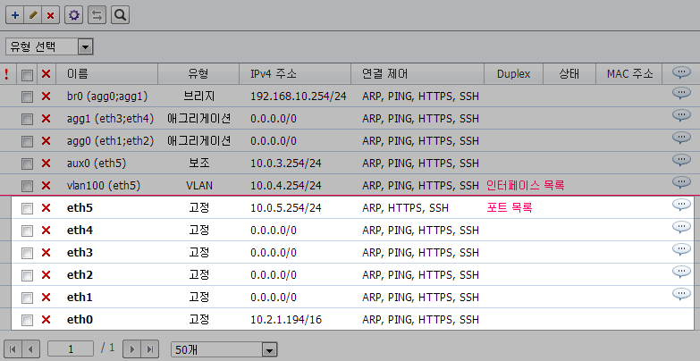 포트는 인터페이스의 최소 단위입니다. 인터페이스는 1개 이상의 포트를 사용해서 구성됩니다. 인터페이스의 구성 방법은 인터페이스 설정을 참고하십시오.