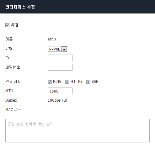 유형으로 PPPoE를 선택하고, ID와 비밀번호를 입력합니다. 나머지 속성을 지정하고 저장을 클릭합니다.