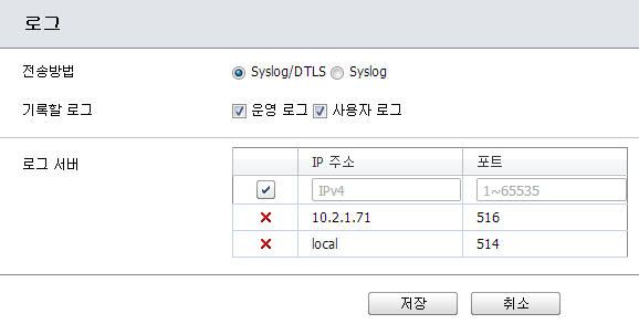 - 전송방법(Syslog/DTLS, Syslog): 로그 전송 연결을 암호화하려면