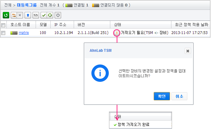 가져오기 필요(TSM <- 장비)는 장비의 로컬 설정/정책에 변경이 있었음을 의미합니다. 아이콘을 누르면