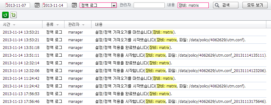 모든 변경 내역을 확인하려면 시스템 로그에서 정책 로그를, 내용에 "장비: 호스트 이름"을 입력하고 검색하십시오.