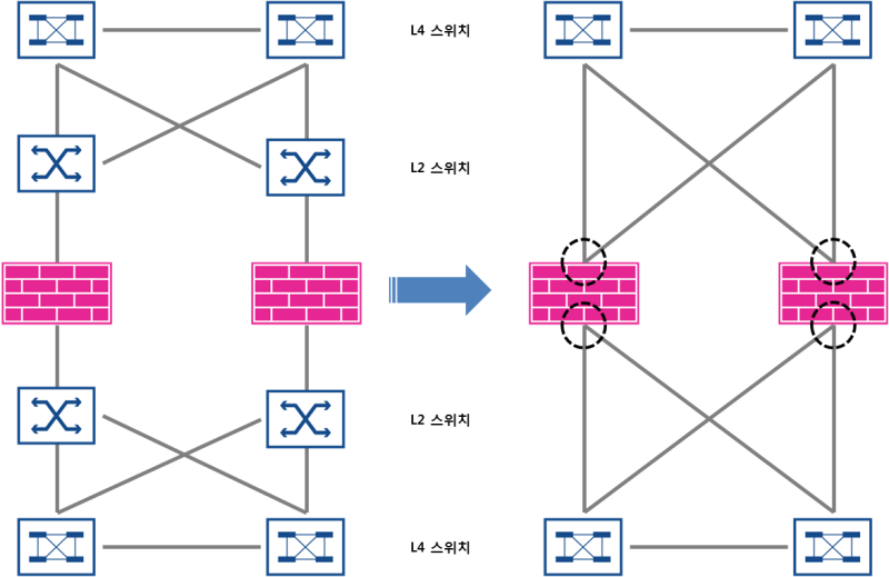 왼쪽은 애그리게이션 인터페이스를 사용하지 않고 구성한 메시(mesh) 네트워크, 오른쪽은 애그리게이션을 사용한 메시 네트워크입니다. 동그라미로 표시한 위치가 애그리게이션 인터페이스를 구성할 자리입니다.
