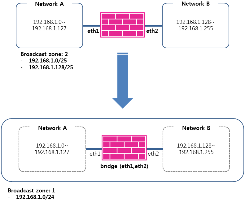 eth1, eth2에 연결된 네트워크는 서로 분리되어 있습니다. eth1에 연결된 네트워크 A, eth2에 연결된 네트워크 B는 각각 서로 다른 브로드캐스트 네트워크입니다. eth1과 eth2를 묶어서 브리지를 구성하면 네트워크 A와 B는 하나의 단일한 네트워크를 형성합니다. 예를 들면,