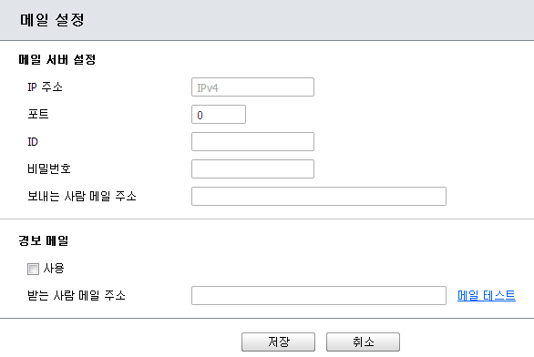 경보 메일 전송에 사용할 SMTP 서버 속성을 입력합니다. 설정을 변경한 다음에는 저장을 클릭합니다.