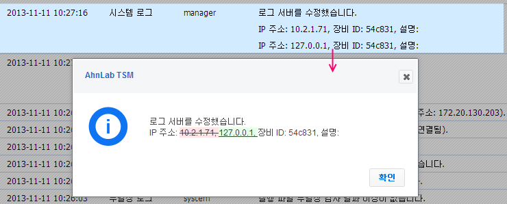 로그 행에서 내용을 클릭하면 팝업 창에서 로그를 보여줍니다. 다음 그림은 로그 서버 수정 전/후 내역을 기록한 시스템 로그의 예입니다. 확인을 클릭하면 창을 닫습니다.