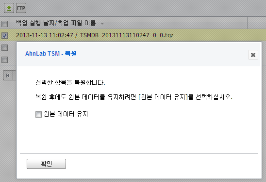 복원에 사용한 원본 백업 파일을 제거하지 않고 유지합니다.