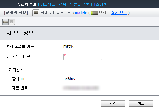 TrusZone VTN의 호스트 이름을 설정하고, 장비 ID와 제품 번호를 확인합니다.